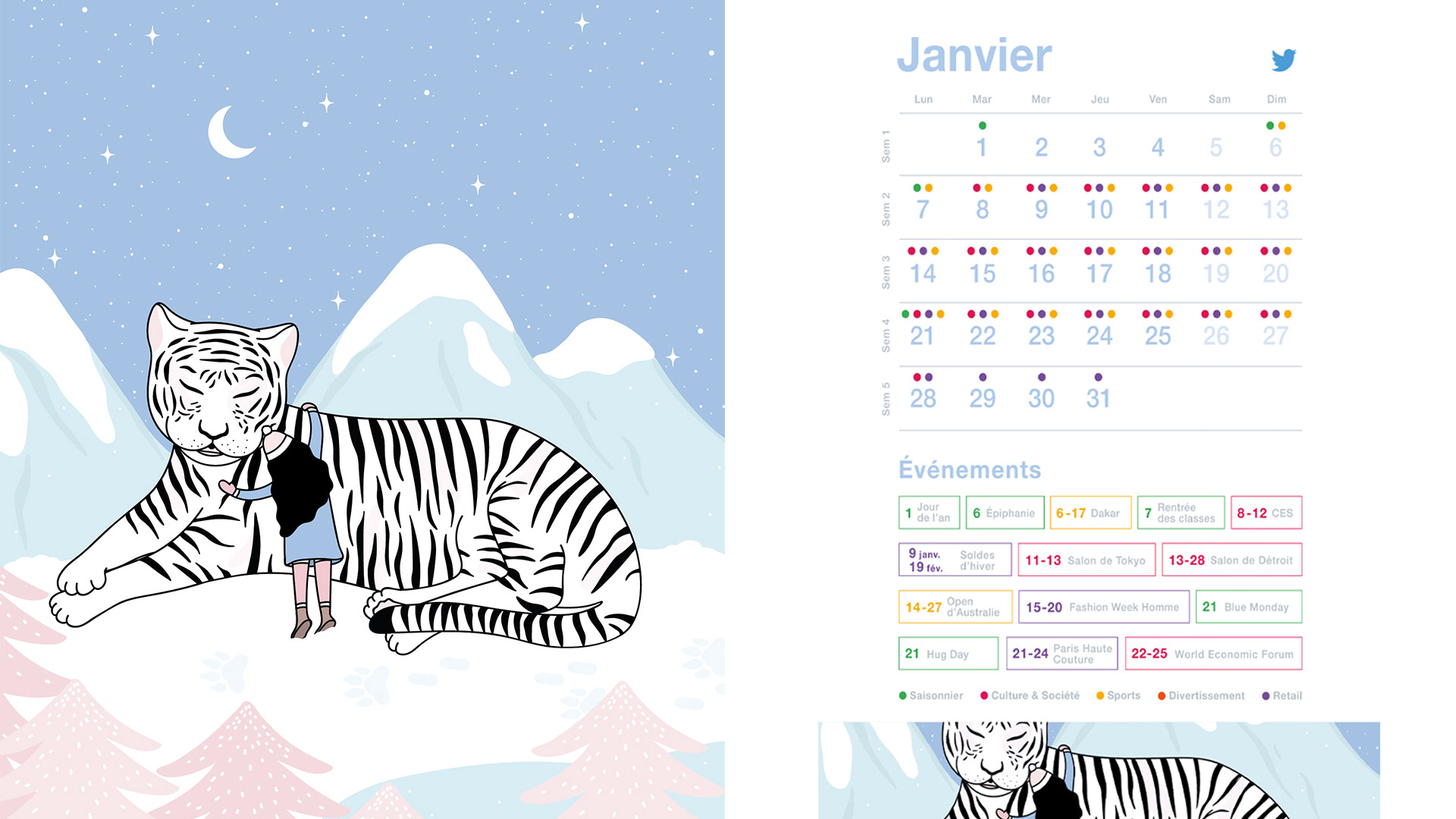 Illustration pour le calendrier 2019 de Twitter France. 1 illustrateur(trice) différent par mois, janvier pour célébrer la journée internationale des câlins (Hug day).